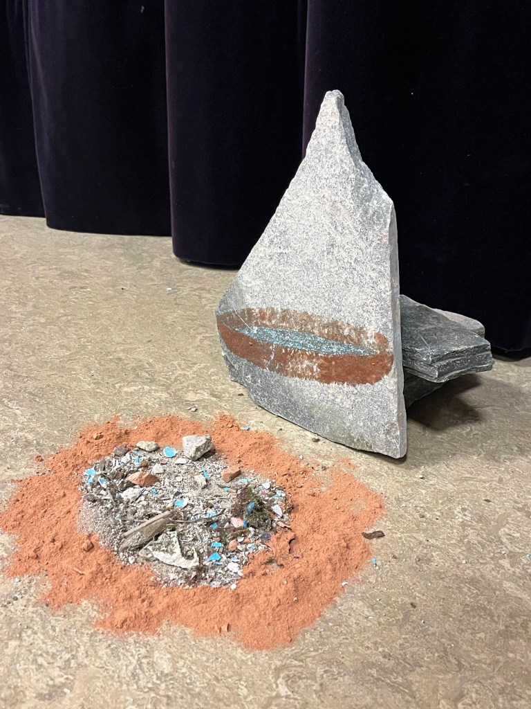 pigment powder made out of rubble and a painted drawing , made with the rubble paint, on the rubble, 2023.